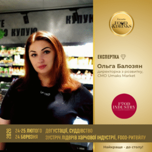 Радо вітаємо у складі суддівського комітету Food Industry Solutions досвідчену та креативну експертку Ольгу Балозян, директорку з розвитку мережі маркетів UMAKS MARKET, ТОВ Юмакс Україна. У зоні відповідальності пані Ольги наступні напрямки: