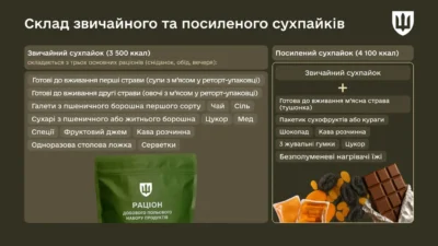 Джерело: https://mod.gov.ua/news/yak-harchuyutsya-ukrayinski-vijskovi-vid-yidalni-do-polovogo-suhpajka